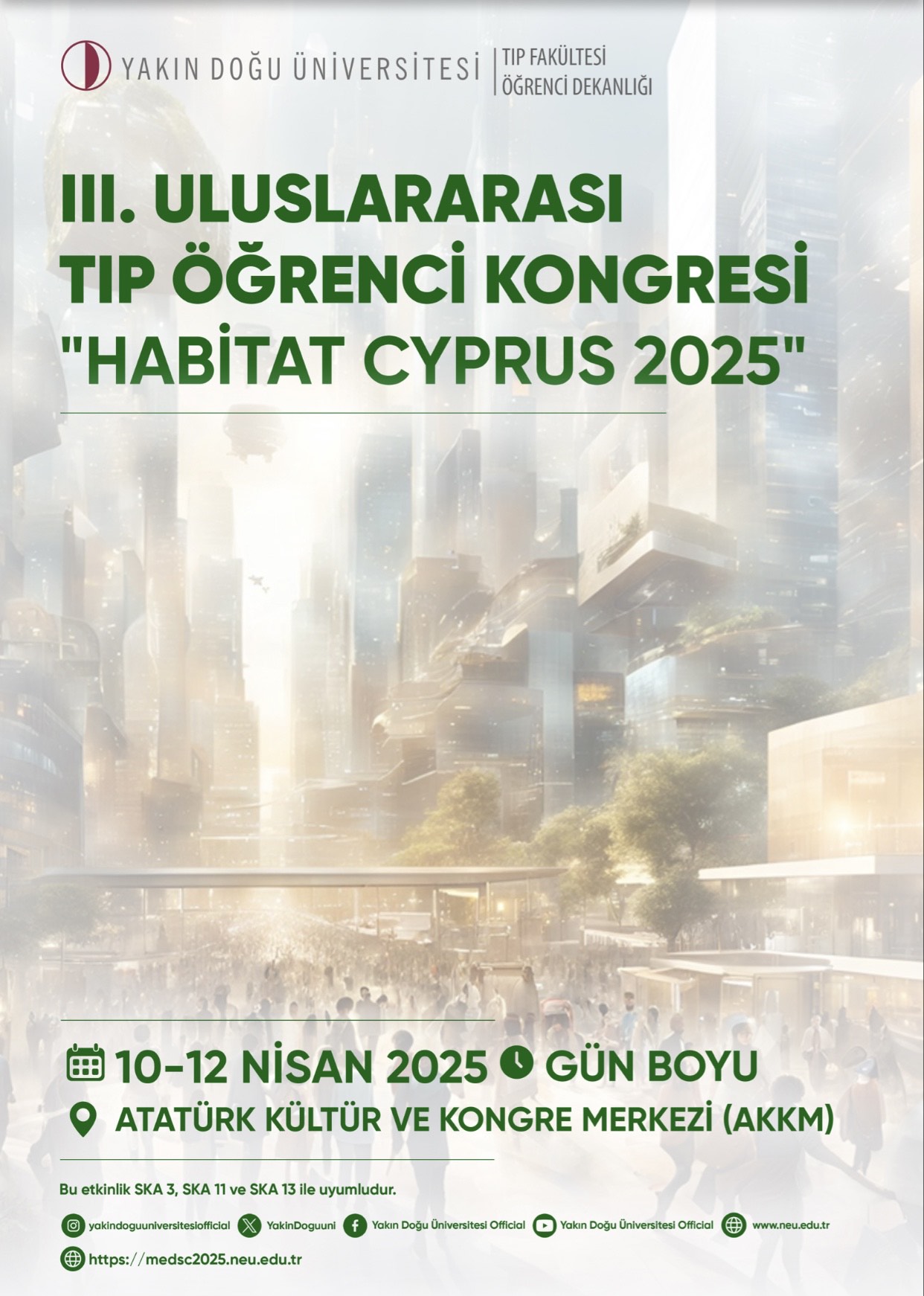 Hoşgeldiniz, Yakın Doğu Üniversitesi bünyesinde bu yıl 10- 12 Nisan tarihlerinde düzenleyeceğimiz 3. Uluslararası Tıp Öğrencileri Kongremizde siz değerli katılımcılarımızı aramızda görmekten kıvanç duyarız. Davetli konuşmacılarımızın katılımlarıyla zenginleşen kongremiz kıymetli akademisyenlerimizin danışmanlığında çeşitli öğrenci sunumlarını bir araya getirerek kendi alanında Kıbrıs’ta öncü bir kongre olmaya devam ediyor. Öğrencilerimizi odağına alan kongremiz bu yıl öğrenci bakış açısıyla Kıbrıs habitatını irdelemek için “Habitat Cyprus 2025” başlığıyla sizlerle buluşuyor. Ulusal öğrenci birliklerinin destekleriyle ilerleyen kongremiz habitatı insanlığın bir bütünü olarak görüyor ve kendi görüşlerini katmak isteyen her öğrenciyi içten bir kucaklamayla kongremize davet ediyoruz .